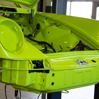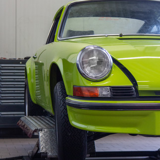 Der 911 2,7l Carrera RS wurde in unserem Haus vor Restaurationsbeginn begutachtet anschließend komplett zerlegt und chemisch entlackt. An der Karosserie waren durch einen damals aktuellen, Unfall, größere Eingriffe notwendig, wir haben, um zu keinem Zeitpunkt eine Diskussion über die Originalität führen zu müssen, ein Teil dieser Karosseriearbeiten bei der Porsche Werksrestaurierung in Auftrag gegeben. Lackiert wurde der RS ebenfalls beim Haus- und Hof Lackierer der Porsche Werksraustauration und anschließend haben wir den RS wieder detailverliebt mit aufgearbeiteten Originalteilen, wieder zusammengebaut.